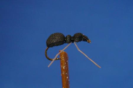 This is a good sized ant pattern and a very simple one. The main ingrediant in this fly is foam so evan if it goes under the surface it will tend to hang in the water rather than sink to the bottom. Size 12.