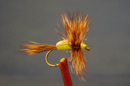 The main ingredient in a humpy is deerhair, the tail, the hump and the wings are all made from deerhair making these flies float like corks. This productive fly works well in fast turbulant water and is worth a try on flat water when other patterns aren't producing. The fly shown is tied with a chartruese underbody and is also available with yellow, Sizes 10, 12, 14.