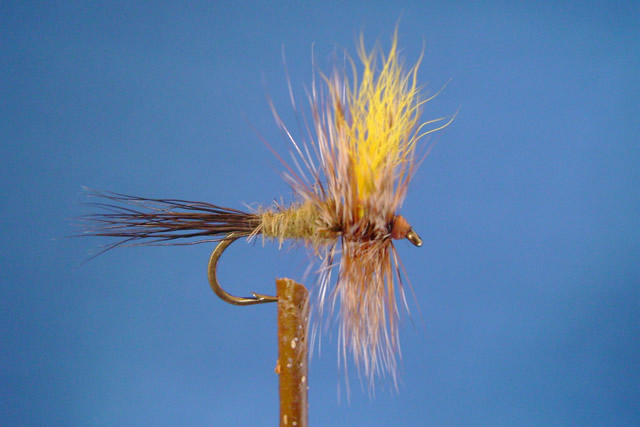 This dry fly hails from the mid atlantic states but works well anywhere trout and salmon reside. This can also be one heck of a bass fly, in other words its a very verstile dry fly. This fly can represent a number of mayflies with its combination of colors and materials. A good choice in fast turbulant water when chasing trout or when cast along the bank of your favorite smallmouth river. offered inĀ sizesĀ 10,12,14.