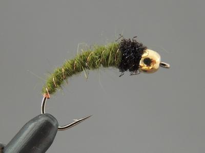Olive body, black head, great caddis nymph imitation. Offered in sizes 10, 12, 14, please specify size or sizes when ordering.